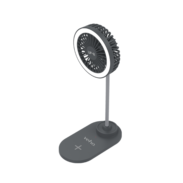 Veho UF-2 عبارة عن محطة سطح مكتب متعددة الأغراض 3 في 1 مزودة بشاحن سريع لاسلكي للهواتف الذكية بقوة 15 وات ومروحة بثلاث سرعات وحلقة ضوء LED ساطعة.